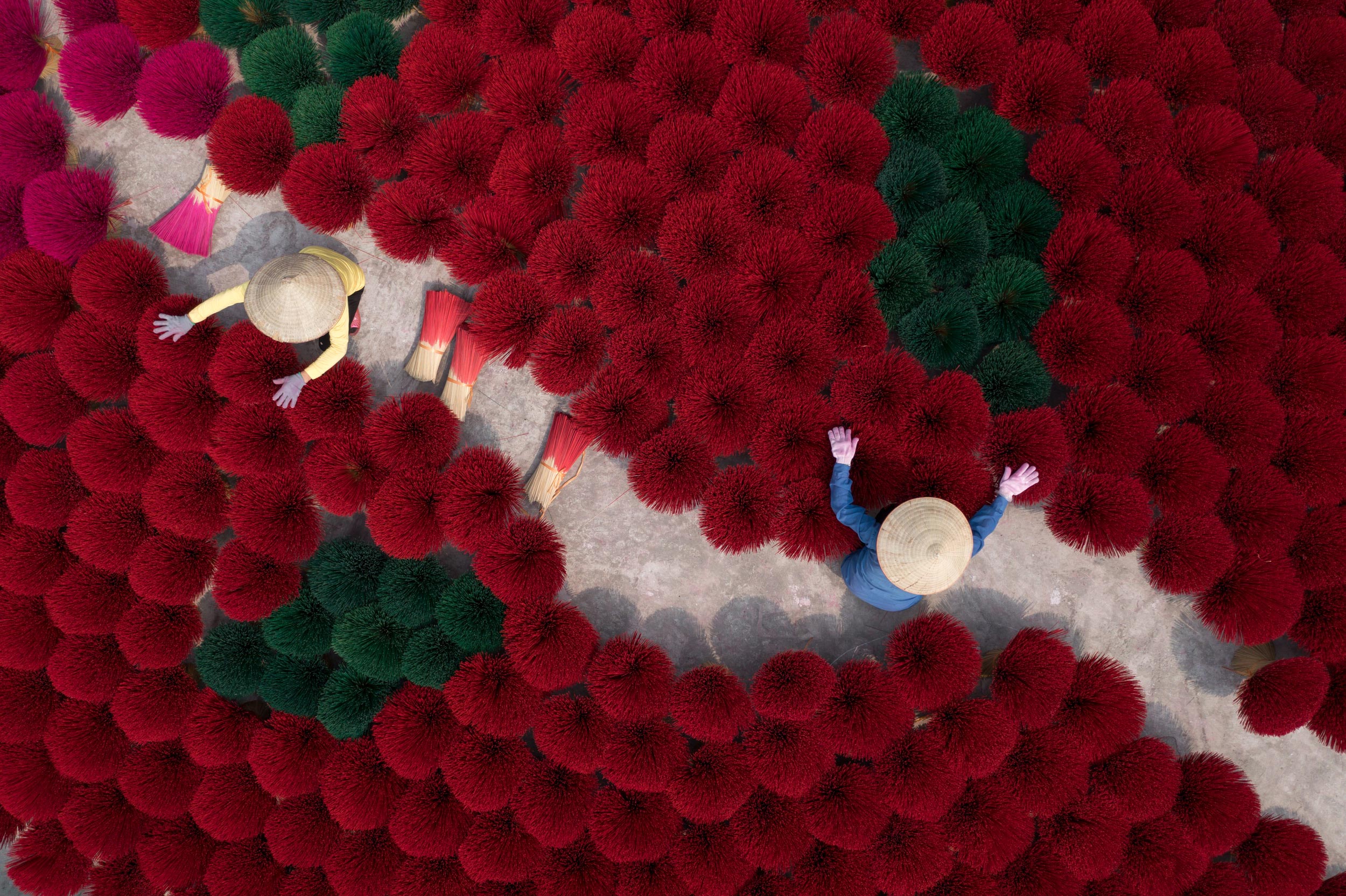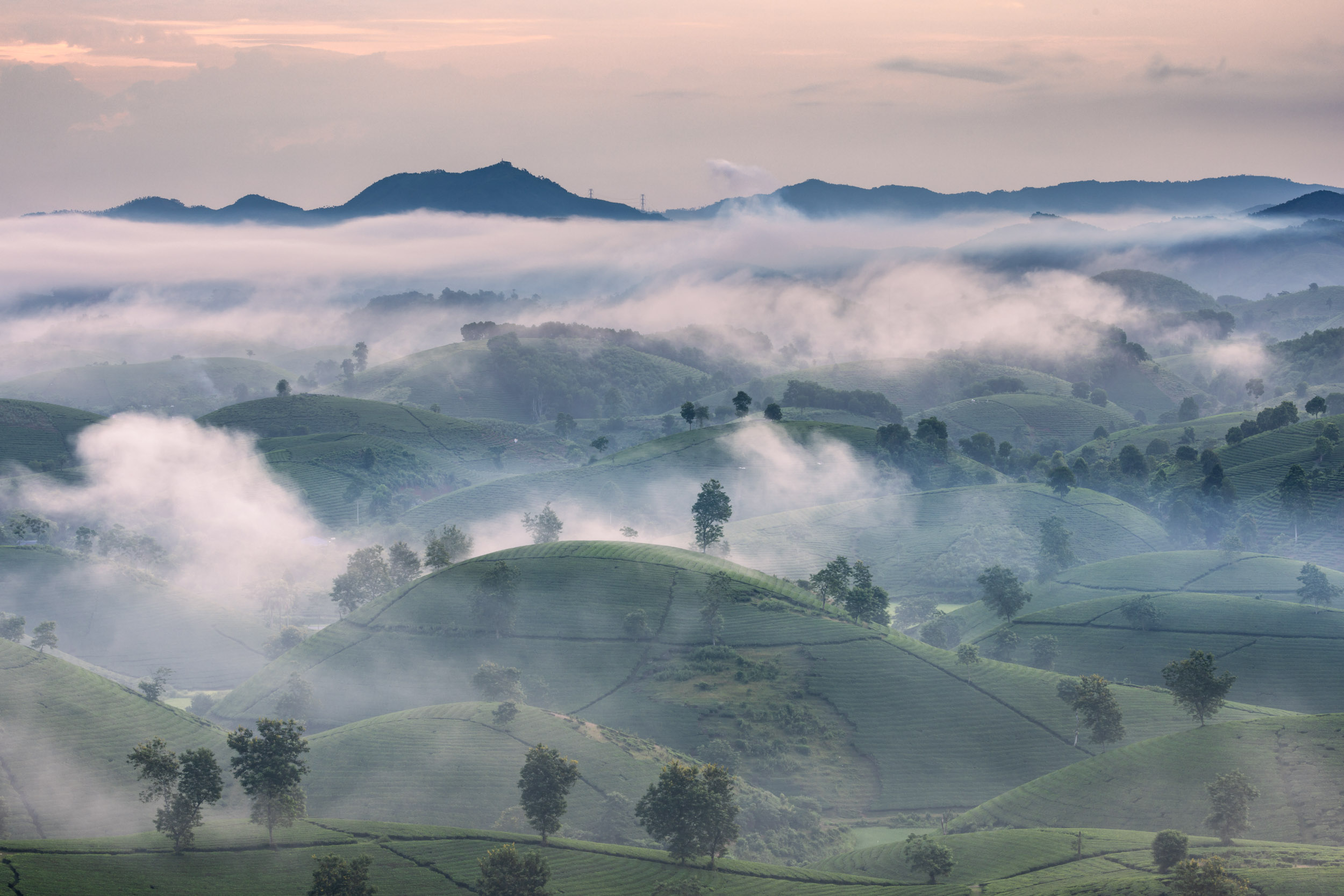 This portfolio of photos of Northern Vietnam, however, is not only about rice. The region is also home to lush tea terraces, particularly in provinces like Long Coc. These rolling hills of neatly planted tea bushes create a serene atmosphere, their orderly patterns contrasting with the ruggedness of the mountains. Early mornings here are especially magical, when mist lingers over the fields and workers in traditional conical hats move through the greenery with careful precision. My photos of these tea terraces reveal a quieter, more meditative side of Northern Vietnam – one where time seems to slow down, and the beauty lies in simplicity and repetition.
